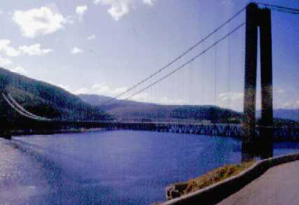 von ganz Europa auf. Von Borgnes aus fahren auch die Fähren zu den Lofoten ab.Etwa 3Km vor Narvik überqueren wir in Skjonnen eine Hängebrücke von 709